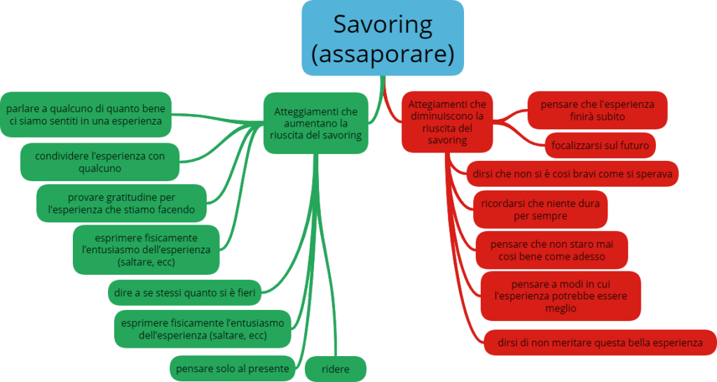 Il savoring significa uscire dall’esperienza stessa per rivederla e apprezzarla e così ci permette di conoscere e gioiredi più quella esperienza, di prestale attenzione e di uscire dal processo di abituarsi e dare per scontate le cose. Jose et al (2012) hanno individuato degli atteggiamenti che aumentano la riuscita di un buon savoring: parlare a qualcuno di quanto bene ci siamo sentiti in una esperienza, condividere l’esperienza con qualcuno, provare gratitudine per l’esperienza che stiamo facendo, pensare che dopo condivideremo questa esperienza raccontandola agli altri, esprimere fisicamente l’entusiasmo dell’esperienza (saltare, ecc), ridere, dire a se stessi quanto si è fieri, pensare solo al presente. Atteggiamenti invece che diminuiscono la riuscita del savoring: pensare che l’esperienza finirà subito, focalizzarsi sul futuro, dirsi che non si è cosi bravi come si sperava, ricordarsi che niente dura per sempre, pensare che non staro mai cosi bene come adesso, pensare a modi in cui l’esperienza potrebbe essere meglio, dirsi di non meritare questa bella esperienza.