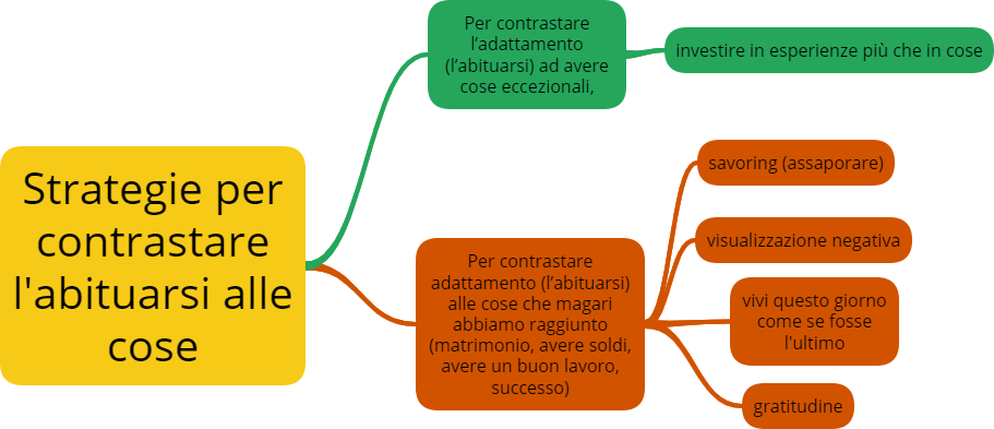 Per contrastare adattamento /l’abituarsi alle altre cose che magari abbiamo raggiunto (matrimonio, avere soldi, avere un buon lavoro, successo), possiamo affidarci al savoring (assaporare l’esperienza), oppure usare la visualizzazione negativa, vivere il giorno di oggi come se fosse l’ultimo e sperimentare la gratitudine. Vediamole una per una: