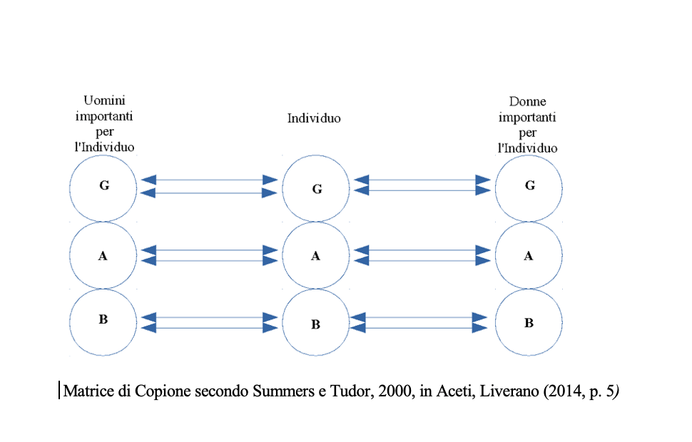 La concezione di copione che abbraccio considera il copione una co-creazione: non sono solo i genitori dall’alto che “impiantano” messaggi ingiuntivi, controingiuntivi o programmi nei loro bambini, ma è la continua influenza reciproca che dà nascita a Stati dell’Io in varie relazioni lungo la vita. In questa linea, si può rappresentare graficamente questa concezione attraverso la matrice di copione di Summers e Tudor (2000): questo tipo di matrice valorizza la intersoggettività tra tutte le figure significative intorno alla persona analizzata: in effetti, si potrebbero rappresentare più persone, oltre i genitori. Tutti i partecipanti sono sulla stessa posizione, per sottolineare il fatto che ognuno ha la sua possibilità di scelta, in base al contesto e non c’è un determinismo dall’alto. Le frecce sono bidirezionali, sottolineando l’influenza reciproca, e i messaggi sono co-creati: il bambino, nel suo percorso evolutivo, ha la possibilità in ogni momento di accettarli o meno, di usarli con rigidità o in base alla situazione, ma anche di rifiutarli.
